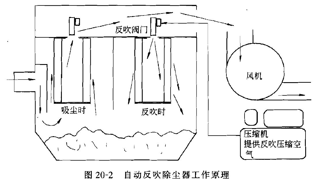 塵分離,丸料進(jìn)入儲(chǔ)料斗繼續(xù)循環(huán)使用,灰塵則通過(guò)連接管進(jìn)入除塵器。自動(dòng)反吹除塵器的結(jié)構(gòu)原理見(jiàn)圖20-2。