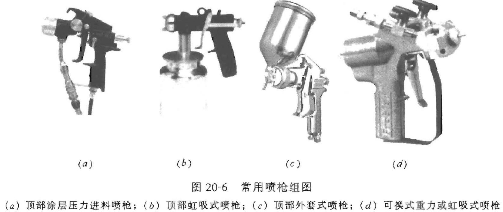 6.噴涂施工應(yīng)按自上而下,先噴垂直面后噴水平面的順序進(jìn)行。噴槍與基層表面應(yīng)接近垂直,噴嘴與被噴面的距離一般為250~500mm。噴槍沿一個(gè)方向來回移動(dòng),使霧流與前一次噴涂面重合一半。噴槍移動(dòng)要求速度均勻,以保證涂層厚度一致,噴涂時(shí)應(yīng)注意涂層不應(yīng)過厚,以防止流淌或溶劑揮發(fā)不完全而產(chǎn)生氣泡,同時(shí)應(yīng)使空氣壓力均勻一致(一般為O.3~0.6MPa)。大面積施工時(shí),可采用高壓噴涂,其壓力一般在1MPa以上。見圖20-7。噴涂完畢后要及時(shí)用有機(jī)溶劑清洗噴涂用具,涂料要加蓋封嚴(yán),一切工具和容器禁止與水接觸。