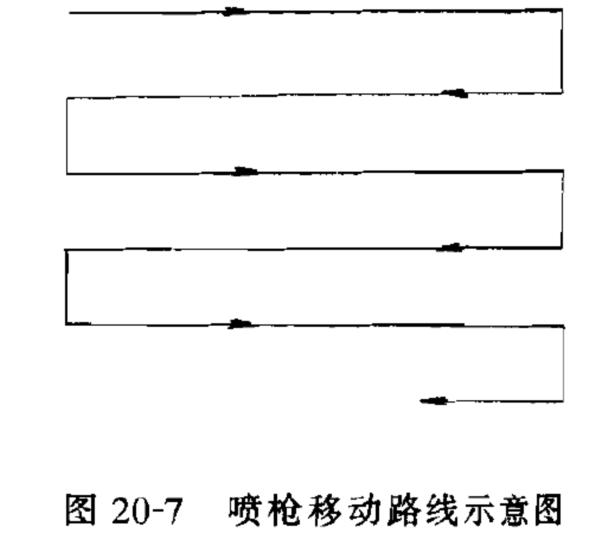 6.噴涂施工應(yīng)按自上而下,先噴垂直面后噴水平面的順序進(jìn)行。噴槍與基層表面應(yīng)接近垂直,噴嘴與被噴面的距離一般為250~500mm。噴槍沿一個(gè)方向來回移動(dòng),使霧流與前一次噴涂面重合一半。噴槍移動(dòng)要求速度均勻,以保證涂層厚度一致,噴涂時(shí)應(yīng)注意涂層不應(yīng)過厚,以防止流淌或溶劑揮發(fā)不完全而產(chǎn)生氣泡,同時(shí)應(yīng)使空氣壓力均勻一致(一般為O.3~0.6MPa)。大面積施工時(shí),可采用高壓噴涂,其壓力一般在1MPa以上。見圖20-7。